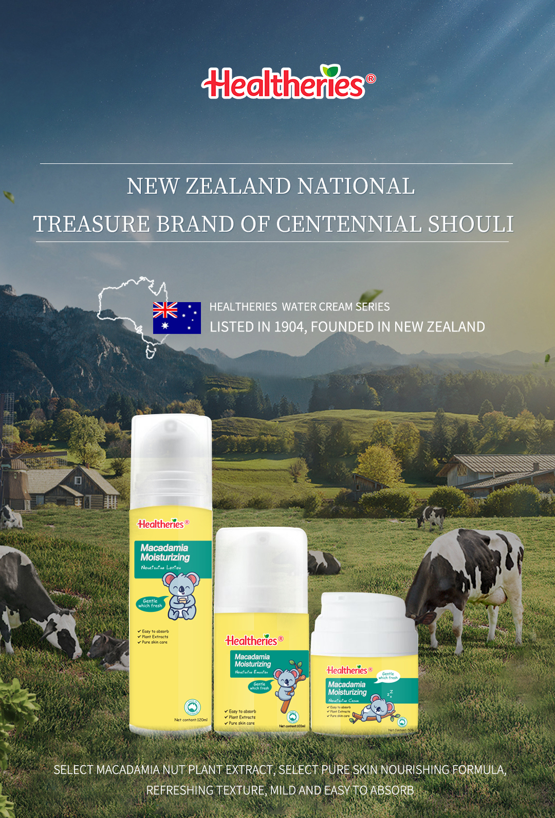 Healtheries含义为健康,澳大利亚、新西兰气候温和,空气纯净无污染,贺寿利将以健康护肤为理念,开创纯净无添加天然有效的科学配方,在自己所熟悉的儿童领域进行研发,开拓婴童市场,将把贺寿利品牌儿童护肤品推向全世界。